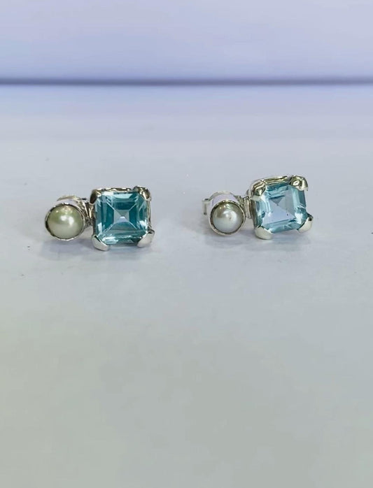 Silver Studs in Natural Blue Topaz Gemstone & Pearl Stud Earrings