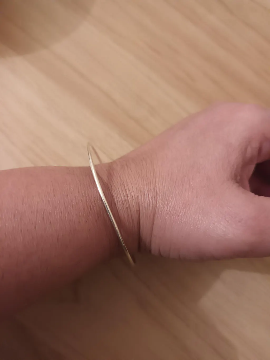 I re-uploaded my review to show a photo of my hand and bangle. As you can see, I have a problem with on-and-off hand swelling and pain, so this bangle is a blessing and ideal for me. It is my daily wear favorite bangle. It is made of slightly malleable silver so I can apply pressure with my other hand and make the bangle slightly elliptical to slide it up my puffy hand and then apply a little pressure to make it circular again once it is on my wrist. I feel happy to wear it and love to look at it. I sleep with it as well, but push it up my arm so it keeps its shape. I will 100 percent buy one or three more when my budget allows me to. Really grateful to have found this website and they are reliable. The bangle is skinny but it somehow looks thicker upon wearing.